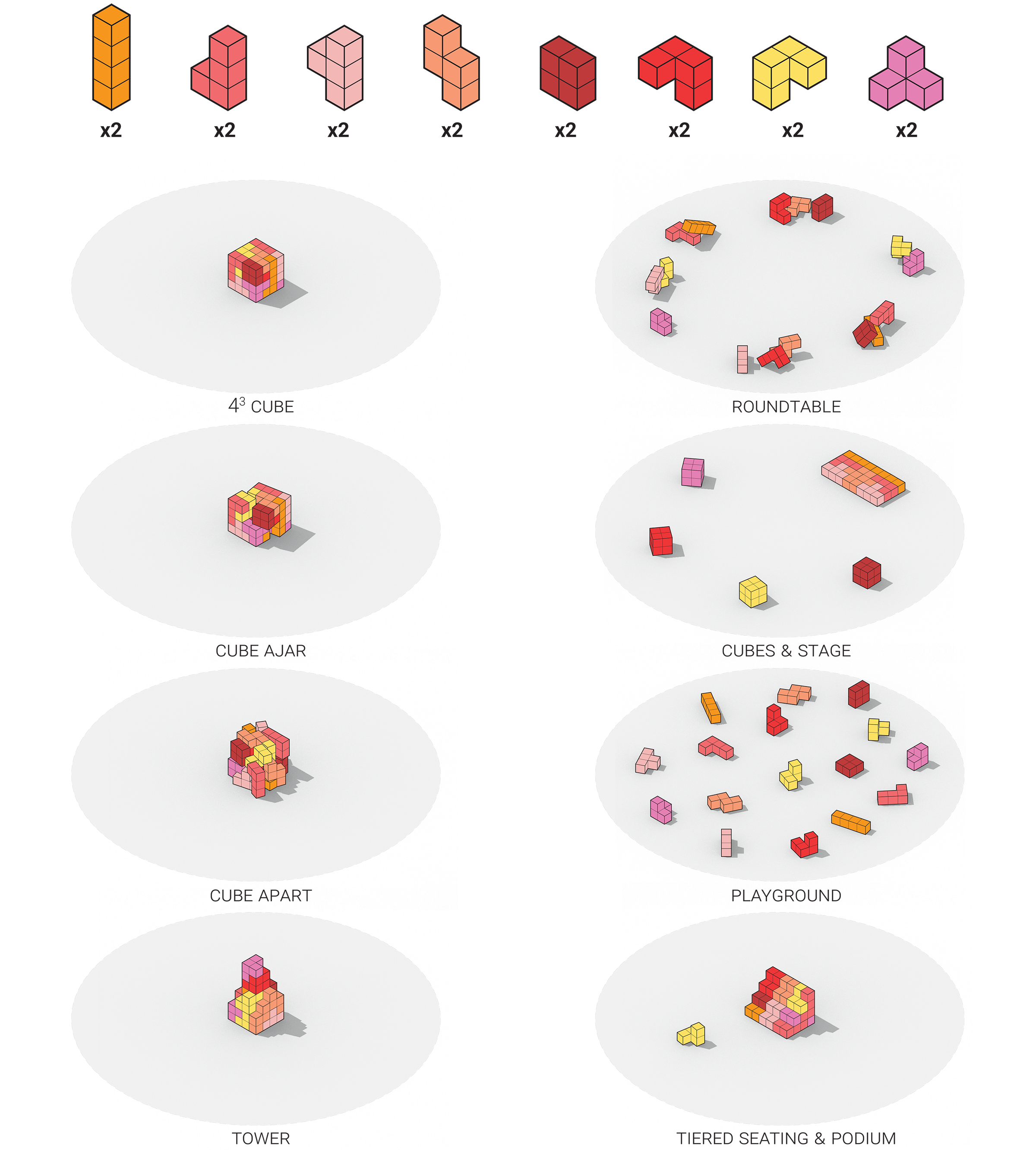 The basic principle behind the proposal is to maintain a dialogue between the part and the whole. Identically sized in total volume and weight so that each could be carried by 2‐3 people with relative ease, not only are the pieces similar to one another but also they can fit together – interlock, stack, and aggregate in geometrically regular ways. The grid further reinforces the appearance of similarity while the limited palette of warm colors helps to distinguish each pair of unique pieces without disrupting the cohesive reading of the whole.