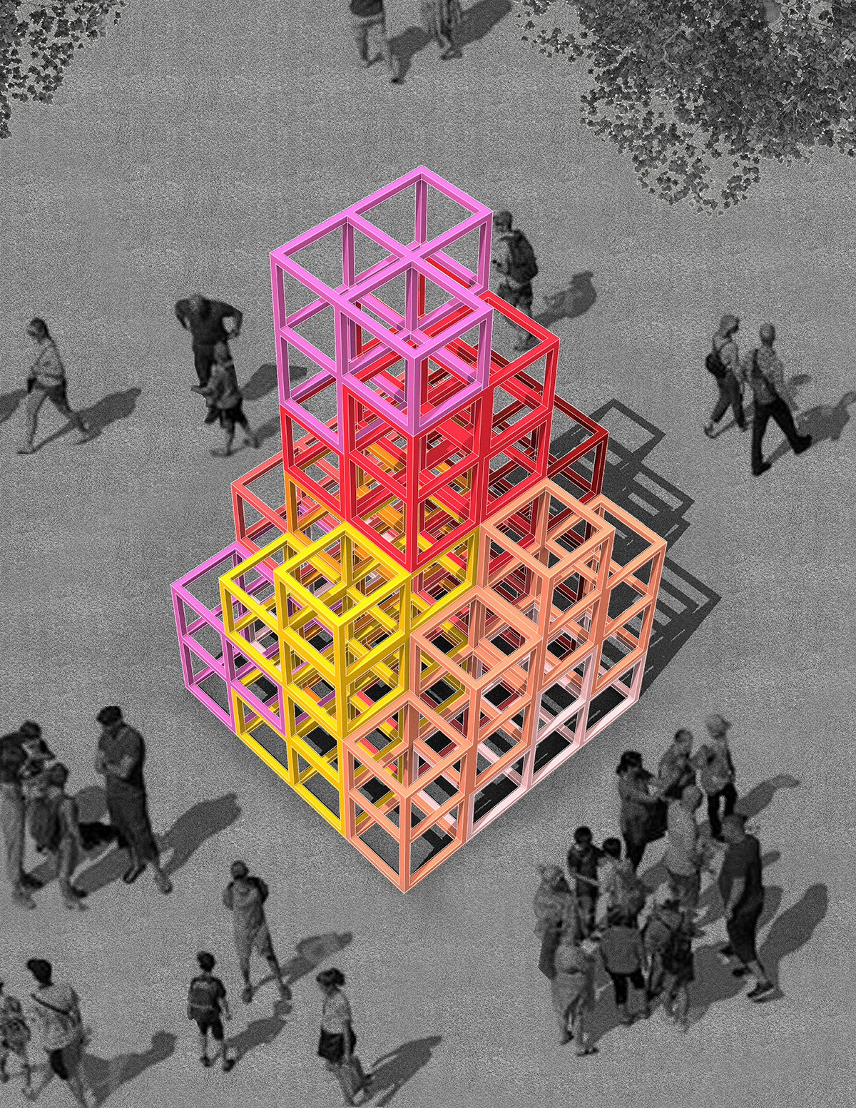 “Field Tetris” proposes creating a family of 16 individually mobile objects called tetracubes that can aggregate systematically or chaotically to create a wide variety of ‘scenes.’ Each tetracube consists of a grouping of four 2’x2’x2’ cubes (there are 8 unique such groupings) and can be packed neatly into a larger 8’x8’x8’ cube or scattered around a particular site like breadcrumbs. As the title suggests, the installation is meant to be played by event organizers, performers or even the audience!