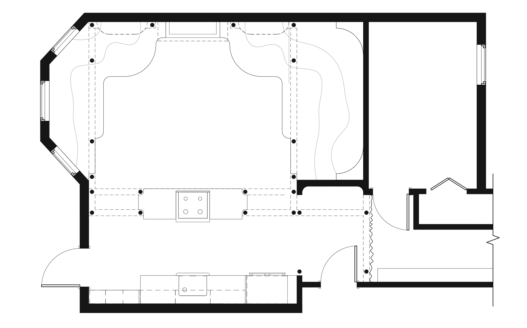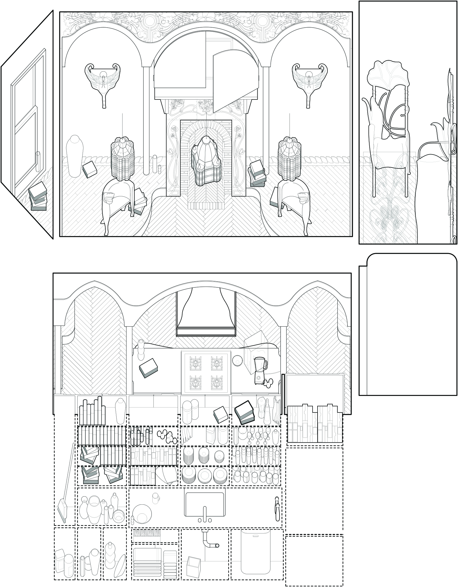 The kitchen has also been reconfigured to open towards the living room symmetrically through two archways flanking the island. The doubling of the archways around the island creates an effect of reverberating curvatures and constant reframing of every view around this rather small space.